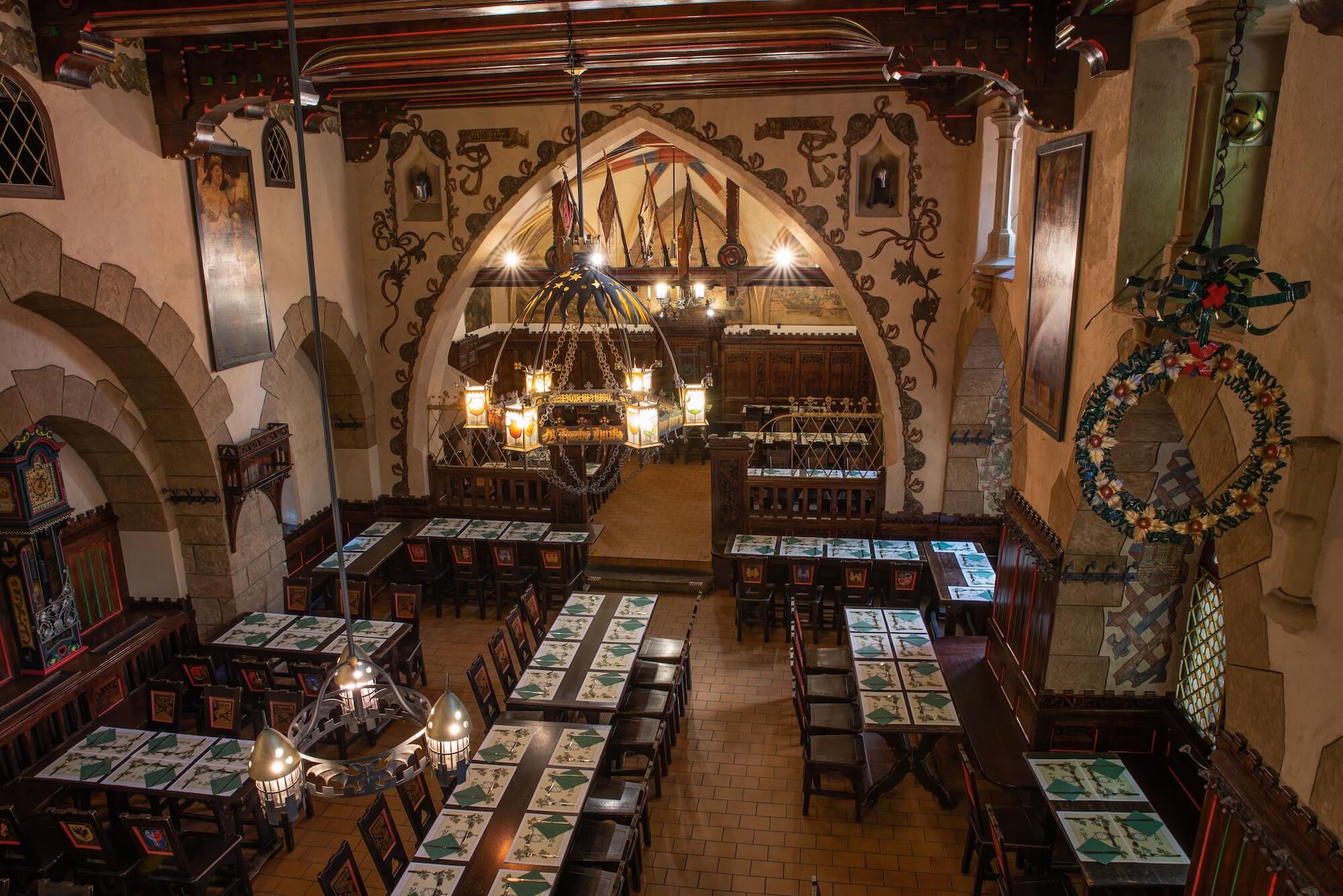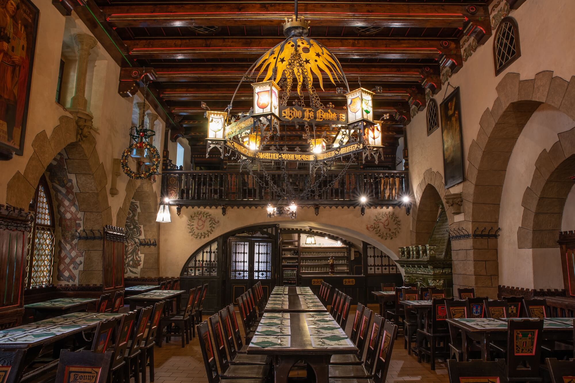 Zweitgrößter Saal des Restaurants bietet 150 Sitzplätze an. Auf den ersten Blick bemerken Sie schön dekorierte Wände mit einem Porträt des ersten Braumeisters in Lebensgröße. Geschnitzte Stühle mit Wappen der tschechischen Städte mit Brauereien locken zum bequemen Sitzen. Eine weitere Merkwürdigkeit ist eine Tür mit den Namen der Braumeister von 1499 bis 1883. Der Rittersaal wurde im romantischen Stil aus einer ehemaligen Kapelle und später Mälzerei umgebaut.